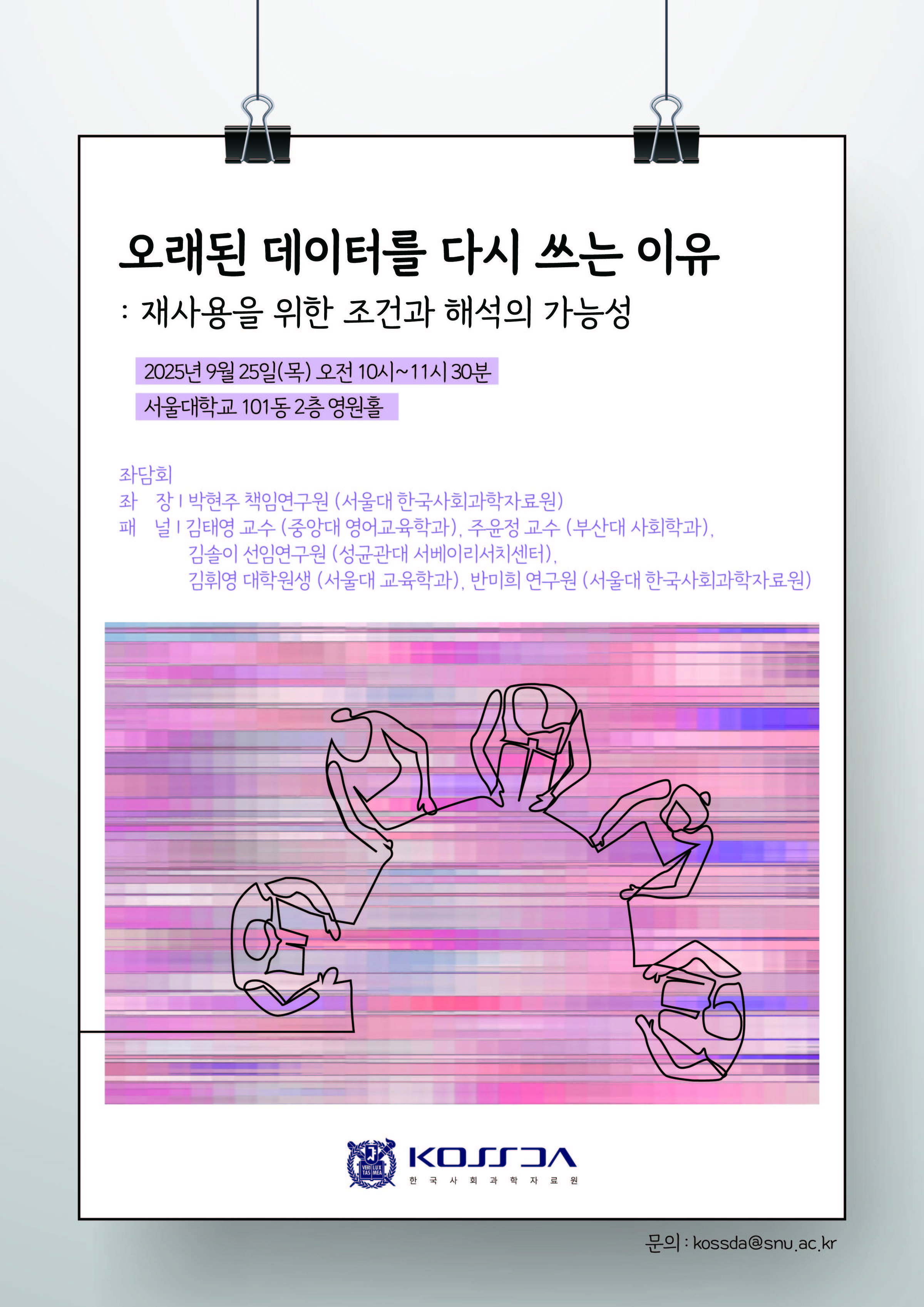 서울대학교 한국사회과학자료원(KOSSDA)은 2025년 9월 25일(목) 서울대학교 101동 2층 영원홀에서 "오래된 데이터를 다시 쓰는 이유: 재사용을 위한 조건과 해석의 가능성" 좌담회를 개최합니다. 이 좌담회는 "KOSSDA 연구데이터 주간 2025" 의 주요 행사이기도 합니다.