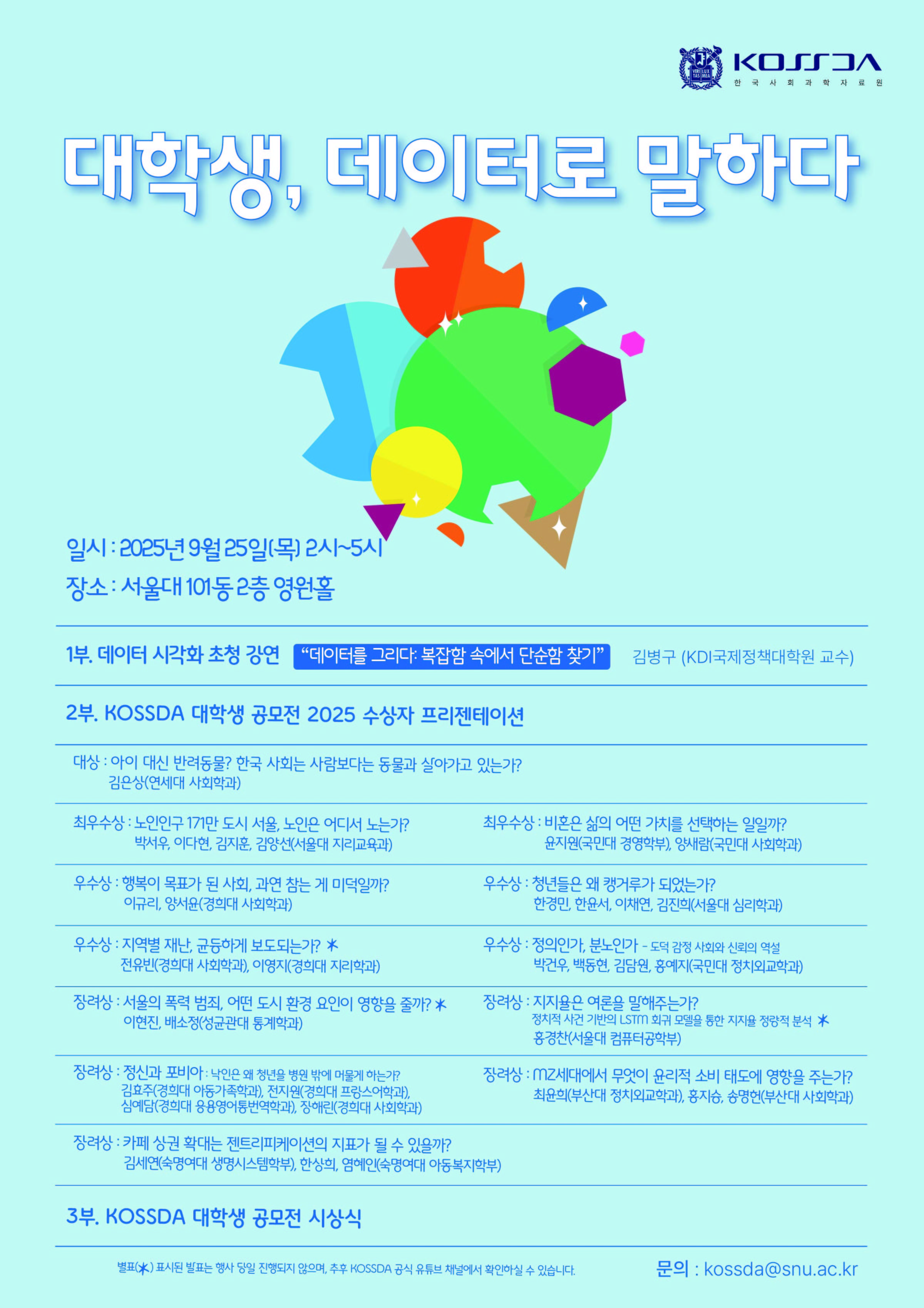 서울대학교 한국사회과학자료원(KOSSDA)은 2025년 9월 25일(목) 서울대학교 101동 2층 영원홀에서 "대학생, 데이터로 말하다" 를 개최합니다. 이 프로그램은 "KOSSDA 연구데이터 주간 2025"의 주요 행사이며, "KOSSDA 대학생 공모전 2025 시상식 및 수상자 프리젠테이션"이기도 합니다.