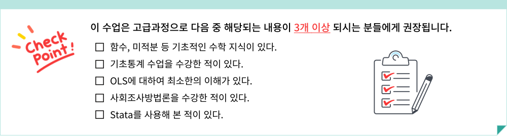 - OLS 리뷰: 연속형 독립변수, 범주형 독립변수 - 상호작용 효과 - 범주형 종속변수: 이항/다항/순서형 - (만일 시간적으로 가능하다면 인과추론의 개념 간략 소개) 이중차분법(difference-in-differences) 원리의 이해 |